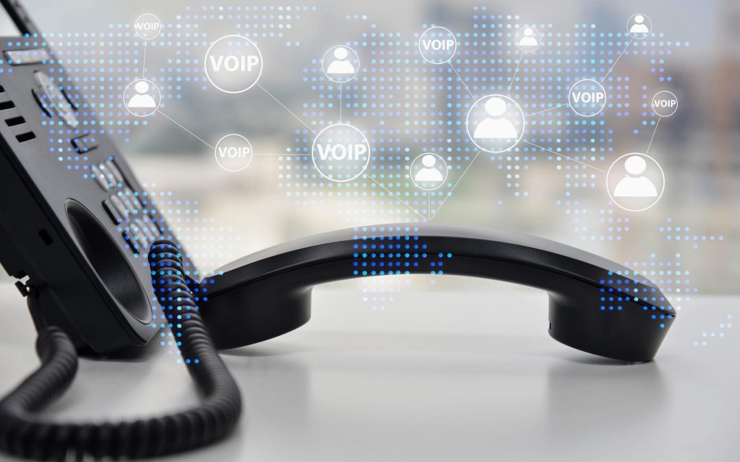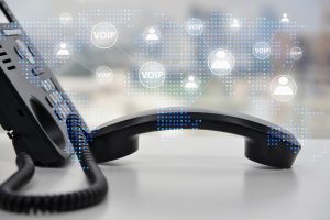 IP Phone double exposure with blue LED world map and business ic